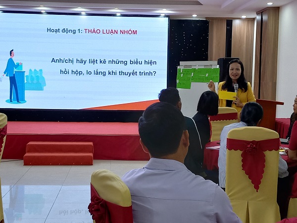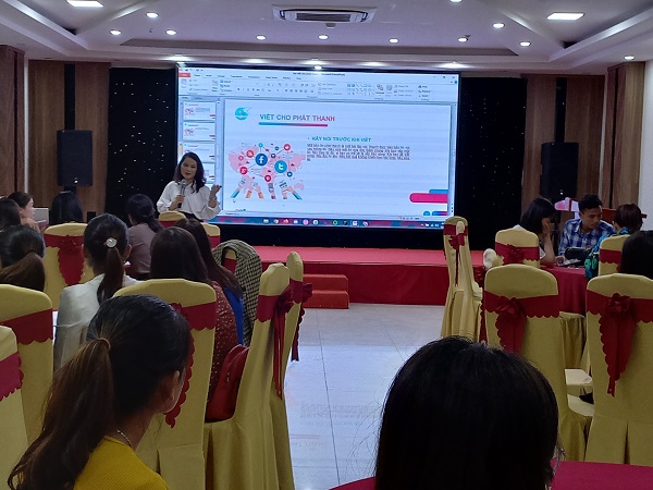 Đ/c Mai Thị Mỹ Trang - UVBTV, Trưởng ban TG - Chính sách luật pháp Hội LHPN tỉnh truyền đạt chuyên đề kỹ năng truyền thông qua loa phát thanh, mạng xã hội