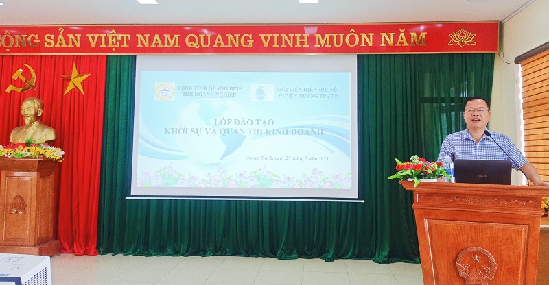 Sáng ngày 27/7/2023, Hội Liên hiệp Phụ nữ huyện Quảng Trạch phối hợp với Hội Doanh nghiệp tỉnh tổ chức lớp Đào tạo Khởi sự và Quản trị kinh doanh cho 60 học viên là chủ hộ kinh doanh, các nữ doanh nghiệp, người lao động nữ tại các mô hình, cơ sở sản xuất, Hợp tác xã, Doanh nghiệp, Câu lạc bộ Phụ nữ Khởi nghiệp, nữ doanh nghiệp trên địa bàn huyện.