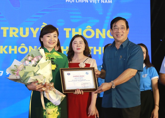 Bà Trương Thu Thủy, Trưởng Ban Gia đình Xã hội Hội LHPN Việt Nam trao giải cho 3 đội đạt Giải Ba