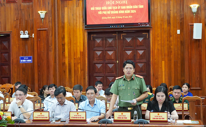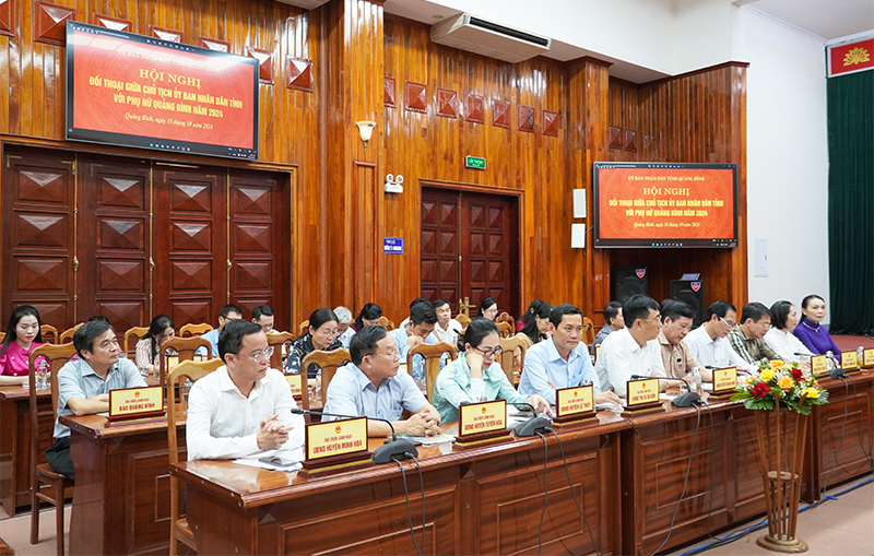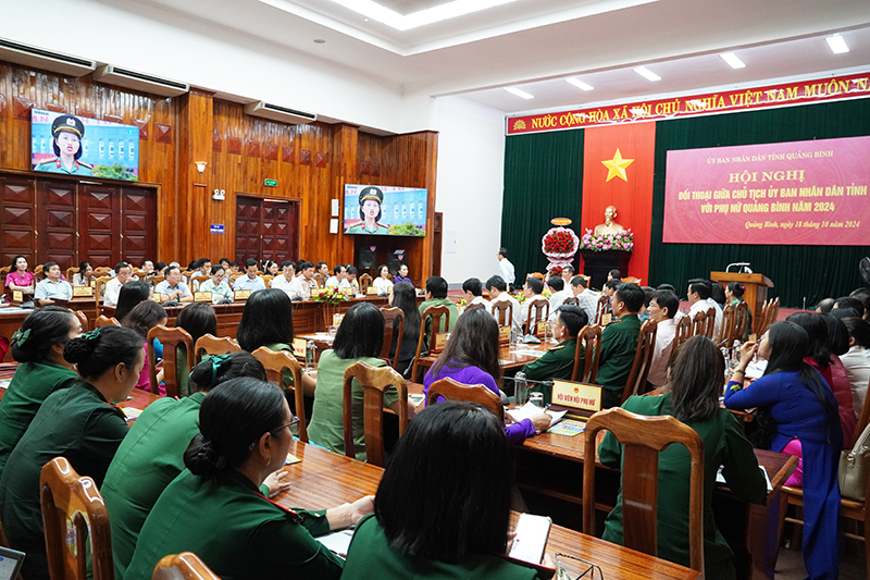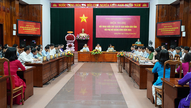 Sáng 18/10, UBND tỉnh tổ chức hội nghị đối thoại giữa Chủ tịch UBND tỉnh với phụ nữ Quảng Bình năm 2024 với chủ đề "Phụ nữ Quảng Bình với công tác chuyển đổi số" do đồng chí Trần Thắng, Phó Bí thư Tỉnh ủy, Chủ tịch UBND tỉnh chủ trì. Tham dự có đồng chí Hoàng Xuân Tân, Tỉnh ủy viên, Phó Chủ tịch UBND tỉnh; đại diện lãnh đạo, cán bộ phụ nữ các sở, ban, ngành; đại diện hội viên phụ nữ trong tỉnh.