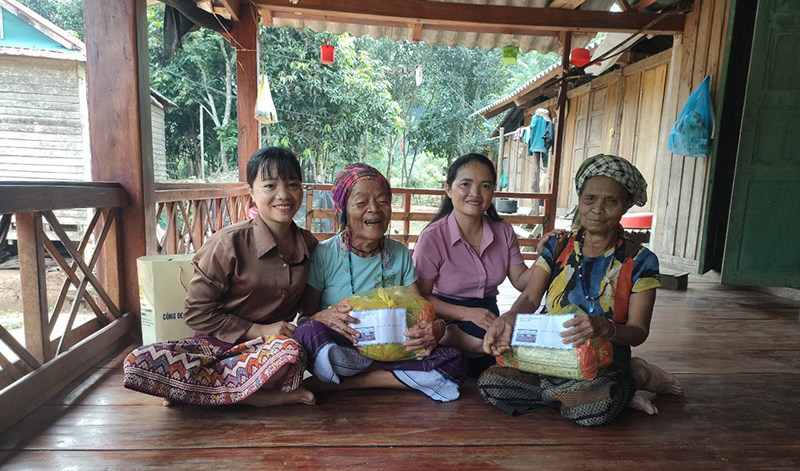 Chủ tịch Hội LHPN xã Thượng Trạch Y Buốt (bìa trái) trao tặng quà cho bà con.