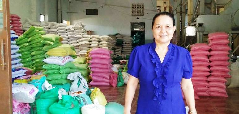 Chị Hoàng Thị Châu bên mô hình xay xát lúa gạo