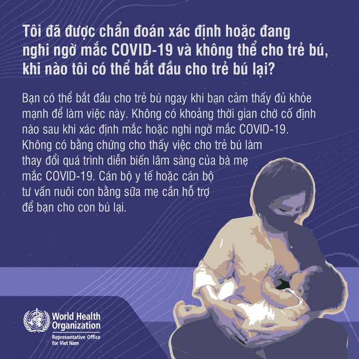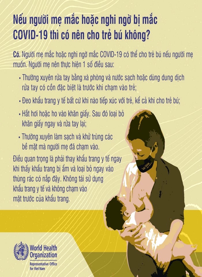 Covid-19 có thể lây nhiễm qua việc cho trẻ bú mẹ không? Nếu người mẹ mắc hoặc nghi ngờ mắc COVID-19 thì có nên cho trẻ bú không? Người mẹ mắc hoặc nghi ngờ mắc COVID-19 và không thể cho trẻ bú, thì khi nào mẹ có thể cho trẻ bú lại? Ở những nơi có dịch COVID-19, các mẹ có nên cho trẻ bú mẹ không? Những câu trả lời bạn có thể tìm thấy ở đây: