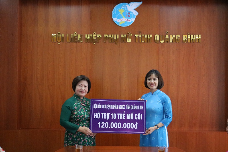 Tiếp tục các hoạt động trong Chương trình “Mẹ đỡ đầu - Kết nối yêu thương” do Ban Thường vụ Hội LHPN tỉnh Quảng Bình đang triển khai, thực hiện, sáng ngày 06/7/2022, Hội bảo trợ bệnh nhân nghèo tỉnh Quảng Bình đã trao cho Hội LHPN tỉnh biển tượng trưng 120 triệu đồng để hỗ trợ đỡ đầu cho 10 trẻ mồ côi có hoàn cảnh đặc biệt khó khăn đang sinh sống tại huyện Lệ Thủy, Bố Trạch, Tuyên Hóa, Minh Hóa và thị xã Ba Đồn.