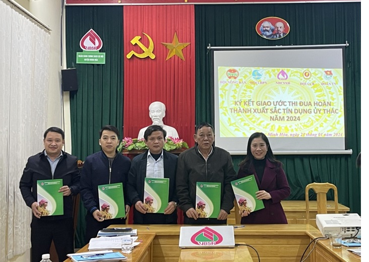 Nhằm đánh giá kết quả hoạt động tín dụng ủy thác năm 2023, triển khai nhiệm vụ ủy thác năm 2024, ngày 23 tháng 01 năm 2024 tại trụ sở Ngân hàng Chính sách xã hội (NHCSXH) huyện Minh Hóa, 04 tổ chức chính trị - xã hội cấp huyện nhận ủy thác trong đó có Hội Liên hiệp Phụ nữ (HPN) huyện đã cùng NHCSXH huyện ký kết giao ước thi đua hoàn thành xuất sắc các nhiệm vụ, chỉ tiêu tín dụng ủy thác năm 2024