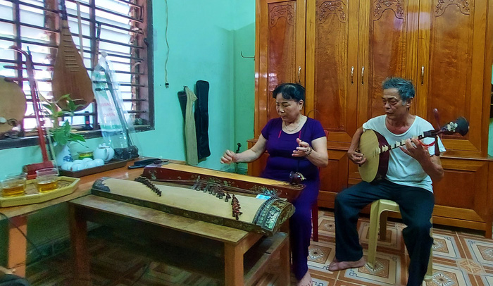 Vợ chồng nghệ nhân ưu tú Hải Lý biểu diễn bài hát Quảng Bình quê ta ơi bằng các nhạc cụ dân tộc.