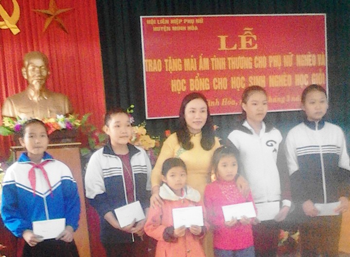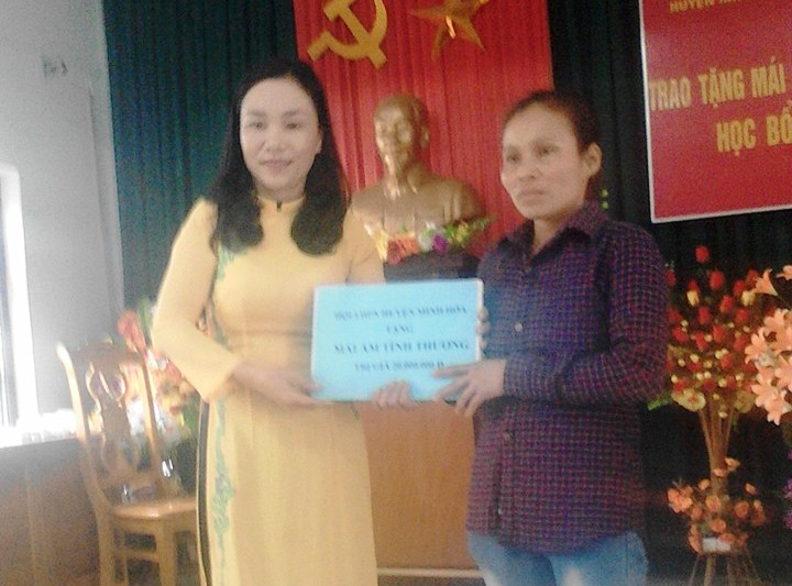 Nhân dịp kỷ niệm Ngày quốc tế phụ nữ 8/3, Hội LHPN huyện Minh Hóa đã tổ chức lễ trao tặng mái ấm tình thương cho phụ nữ nghèo là chị Đinh Thị Hồng Hà ở xã Yên Hóa, huyện Minh Hóa với số tiền 23 triệu đồng nhằm giúp chị ổn định chỗ ở, vươn lên trong cuộc sống. Đây là số tiền do Hội LHPN huyện vận động chị em hội viên, phụ nữ trong toàn huyện quyên góp được.