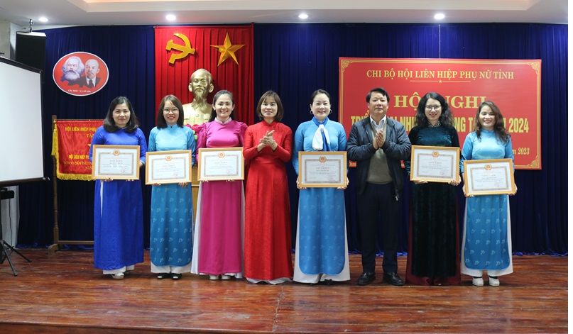 Đại diện lãnh đạo Đảng ủy Khối các cơ quan tỉnh và Hội LHPN tỉnh trao giấy khen cho các đảng viên hoàn thành xuất sắc nhiệm vụ.