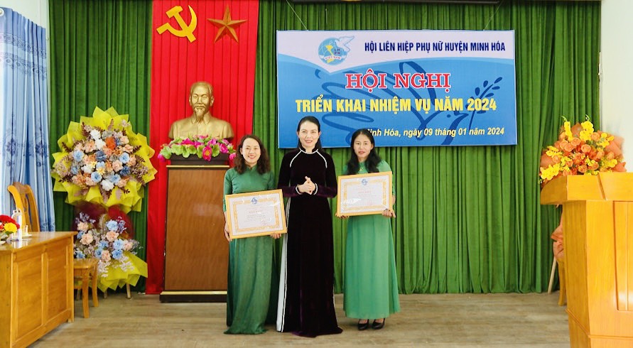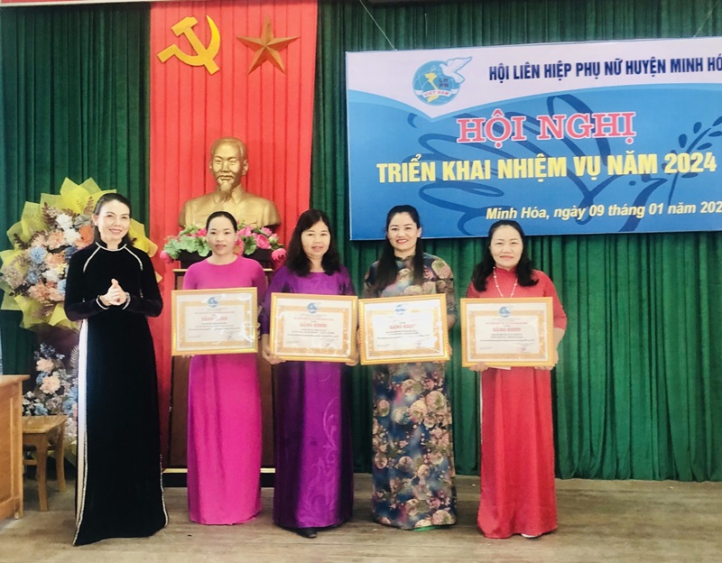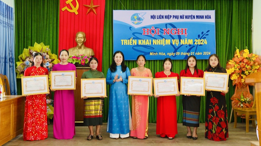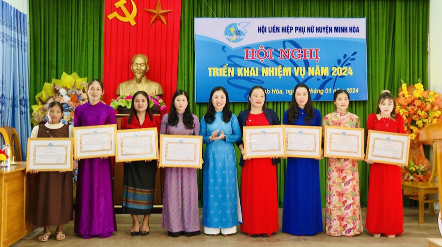 Vừa qua, Hội LHPN huyện Minh Hóa đã tổ chức Hội nghị tổng kết công tác Hội, phong trào phụ nữ và hoạt động ủy thác năm 2023, triển khai nhiệm vụ năm 2024. Đến dự và chỉ đạo Hội nghị có đồng chí Châu Thị Định, Phó Chủ tịch Hội LHPN tỉnh; đồng chí Đinh Thị Thanh Huyền, UVBTV, Trưởng Ban Dân Vận Huyện ủy; đ/c Nguyễn Cảnh Tuấn, UVBTV Huyện ủy, Chủ tịch UBMTTQ Việt Nam huyện, đồng chí Đinh Tiến Dũng, HUV, Phó chủ tịch UBND huyện, các đồng chí đại diện Lãnh đạo Mặt trận, đoàn thể, Ngân hàng CSXH huyện; các đ/c UVBCH Hội LHPN huyện, Chủ tịch, Phó Chủ tịch Hội cơ sở, các tập thể cá nhân điển hình được khen thưởng.