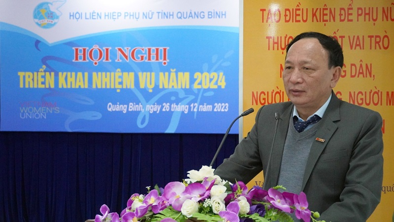 Phát biểu chỉ đạo tại hội nghị, đồng chí Phó Bí thư Thường trực Tỉnh ủy Trần Hải Châu ghi nhận và biểu dương những nỗ lực, thành tựu của tập thể Ban Chấp hành, Ban Thường vụ Hội LHPN tỉnh và cán bộ, hội viên phụ nữ các cấp. Chúc mừng Hội LHPN tỉnh Quảng Bình là 1 trong 8 đơn vị được Trung ương Hội LHPN Việt Nam tặng cờ thi đua “Đơn vị dẫn đầu” năm 2023, đồng chí khẳng định, đây là nỗ lực lớn, vinh dự của Hội LHPN tỉnh nói riêng và của tỉnh nói chung.
