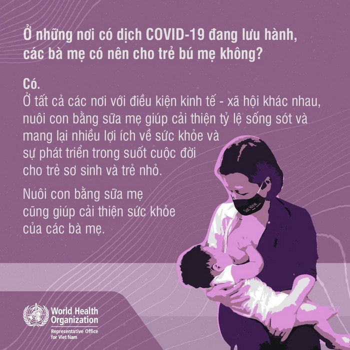 Covid-19 có thể lây nhiễm qua việc cho trẻ bú mẹ không? Nếu người mẹ mắc hoặc nghi ngờ mắc COVID-19 thì có nên cho trẻ bú không? Người mẹ mắc hoặc nghi ngờ mắc COVID-19 và không thể cho trẻ bú, thì khi nào mẹ có thể cho trẻ bú lại? Ở những nơi có dịch COVID-19, các mẹ có nên cho trẻ bú mẹ không? Những câu trả lời bạn có thể tìm thấy ở đây: